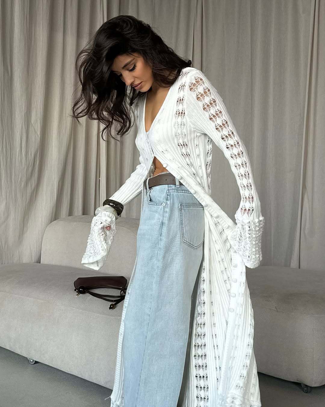 European And American Hot Girl Hollow Knitted Cardigan Bandage Dress Solid Color Long Sleeve V-neck Solid Color Top