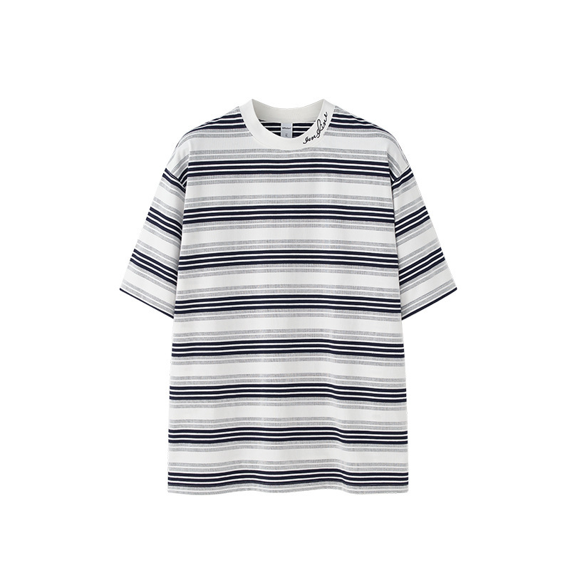 Men’s Striped T-shirt Fine Woven Plaid Loose Street Embroidery